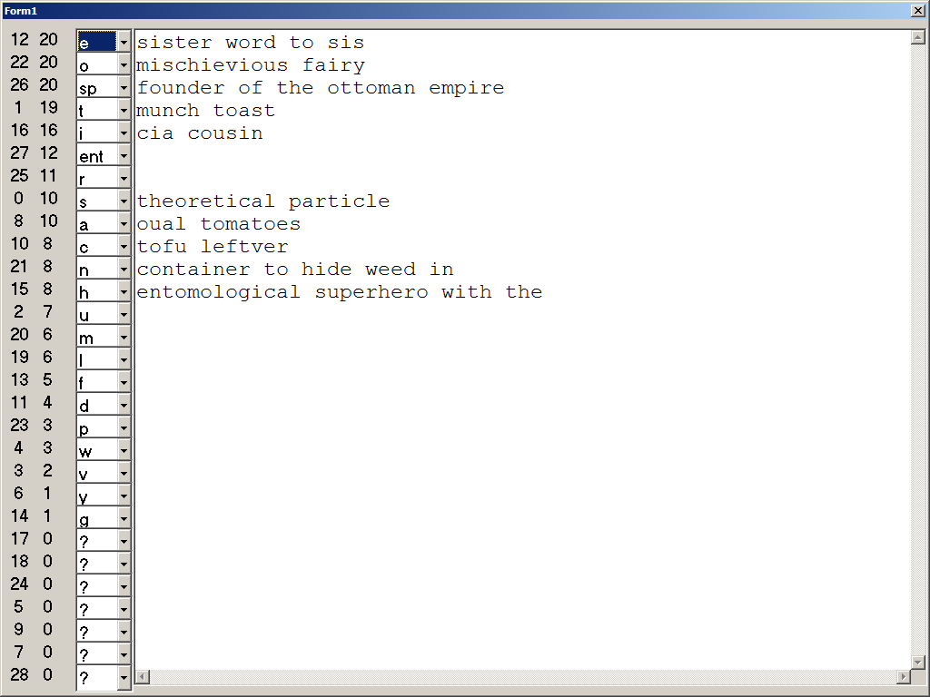 http://i84.photobucket.com/albums/k40/F ... _part6.png I expected something more difficult so I made a program to help me in the cracking process Turned out it only shifted character values by 8, mod 26 (a=0, a'=8; s=18; s'=0, etc); a simple Caesar cipher.